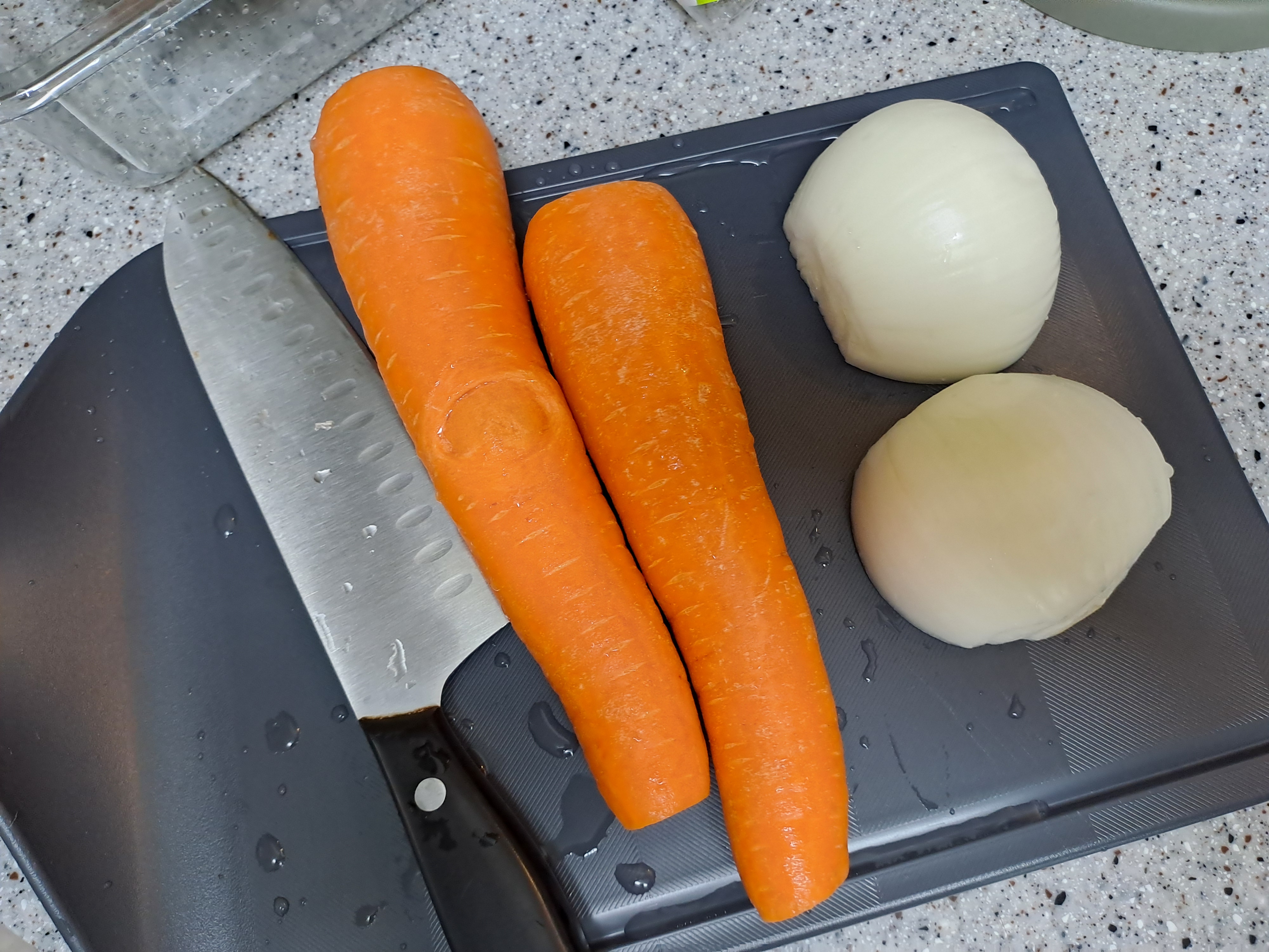 1. 먼저 당근과 양파를 손질해서 씻고 작게 썰어서 준비해 둔다