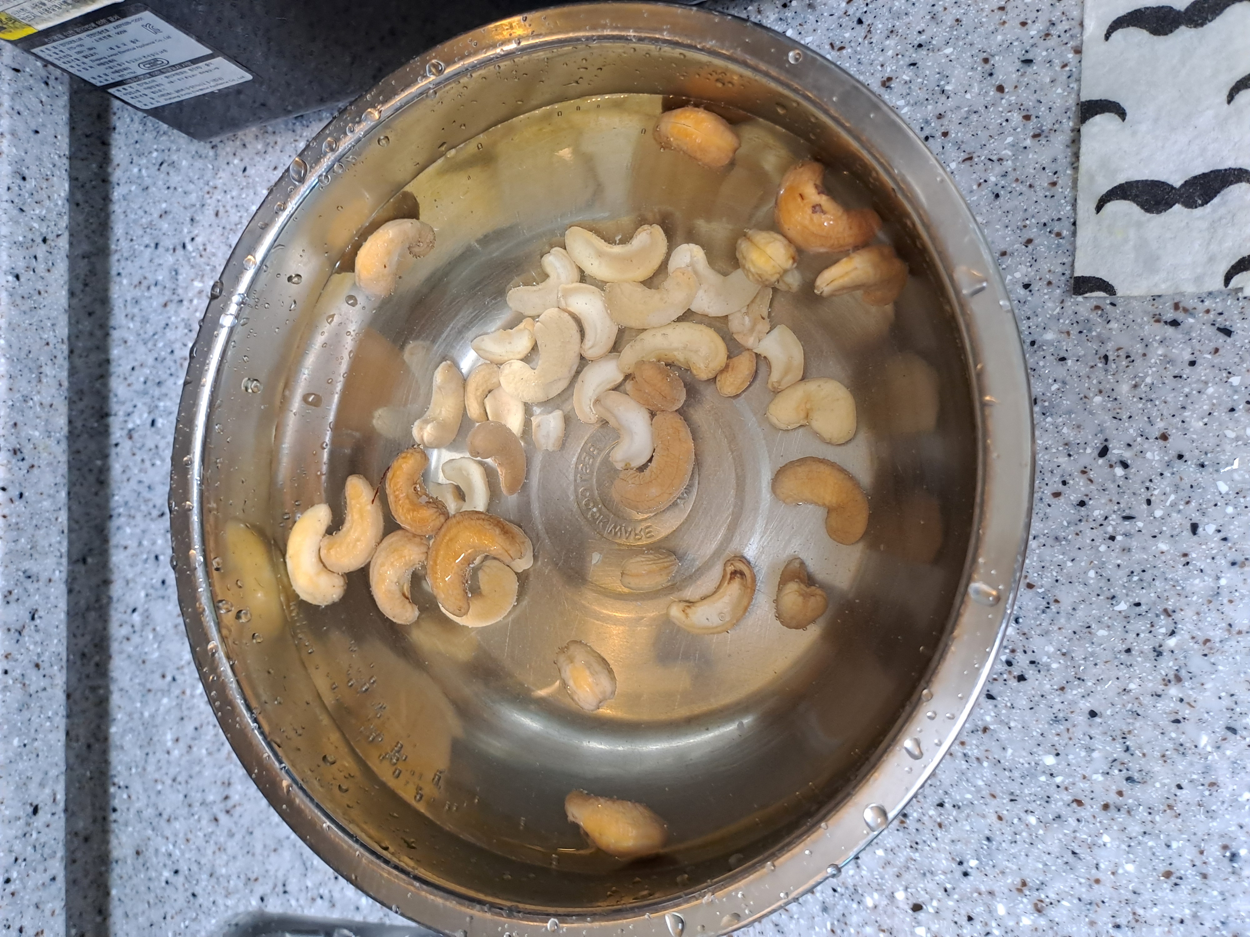 2. 캐슈너트을 물에 씻어서 당근 찌는 동안 물에 불려둔다( 믹서에 잘 갈리게 하기 위한 작업)
